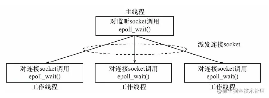 主线程,即epoll_wait存在的线程,属于IO线程,只负责监听读写事件的到来,当epoll_wait结束后,就把触发的读写事件,分发到ThreadPool中,让子线程去执行。