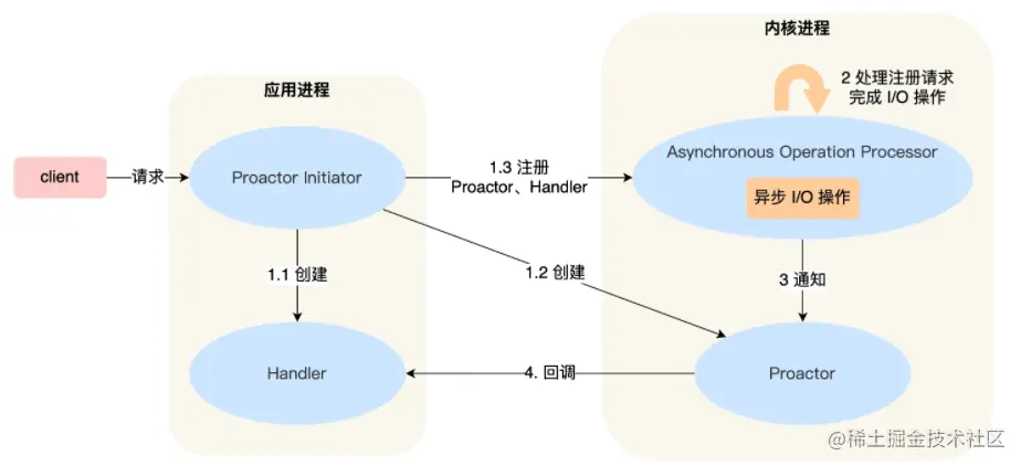 前面提到的 Reactor 是非阻塞同步网络模式,而 Proactor 是异步网络模式。Proactor 正是采用了异步 I/O 技术,所以被称为异步网络模型。