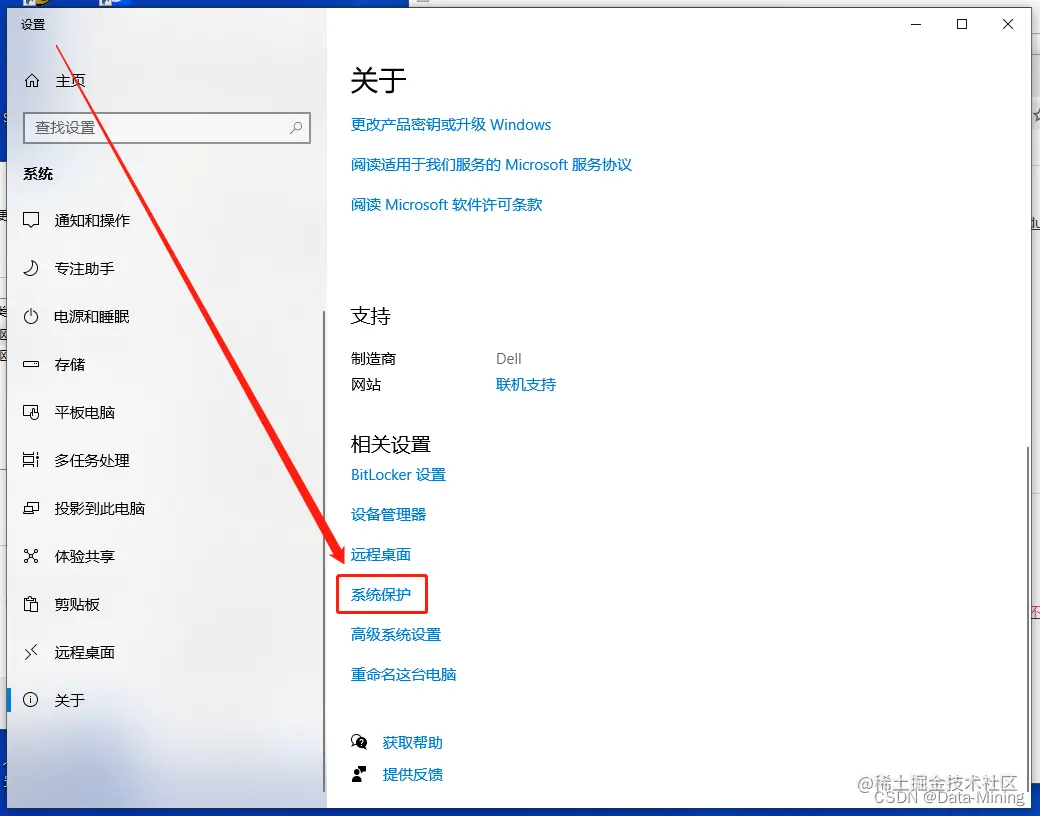 打开系统的“设置”面板,点击“系统保护”,具体操作如下图所示: