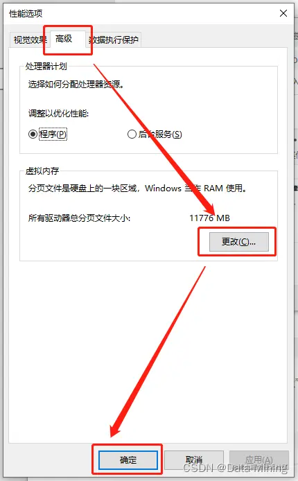 打开“高级”页签后,点击“更改”按钮,具体操作如下图所示:
