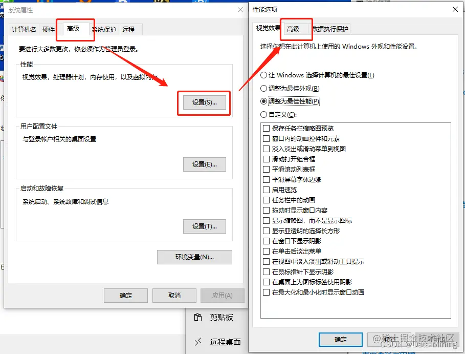 打开系统的“设置”面板,在相关配置中选择“高级系统设置”,之后选择“高级”-“设置”-“高级”,具体操作如下图所示: