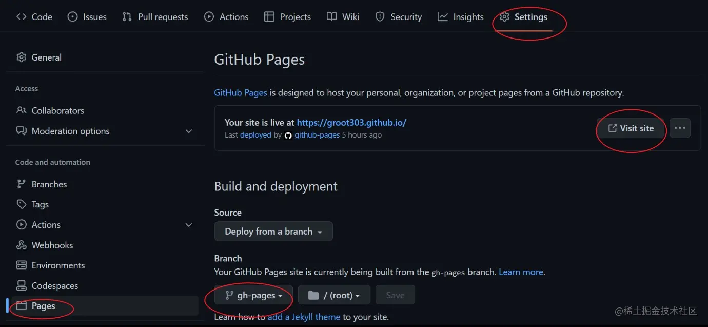 - action成功之后,来到Setting的Pages页面,选择gh-pages然后Save,最后Visit site就可以看到自己搭建的网站啦!