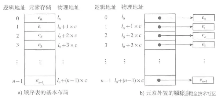 如果元素的大小不统一,则须采用图b的元素外置的形式,将实际数据元素另行存储,而顺序表中各单元位置保存对应元素的地址信息(即链接)。由于每个链接所需的存储量相同,通过上述公式,可以计算出元素链接的存储位置,而后顺着链接找到实际存储的数据元素。注意,图b中的c不再是数据元素的大小,而是存储一个链接地址所需的存储量,这个量通常很小。