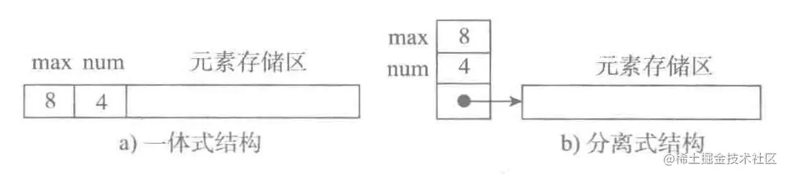 图a为一体式结构,存储表信息的单元与元素存储区以连续的方式安排在一块存储区里,两部分数据的整体形成一个完整的顺序表对象。
