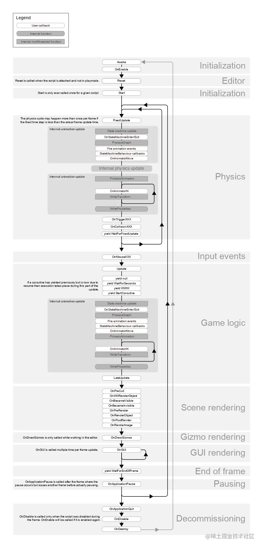 - FixedUpdate 用于物理计算且独立于帧率,固定频率帧调用