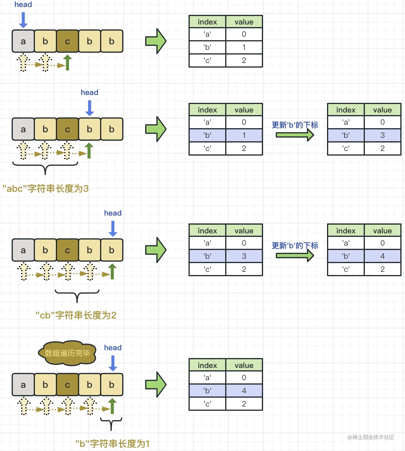 为了更好理解,我们还是举个例子,即:输入字符串为s="abcbb",那么具体的执行流程请见下图所示: