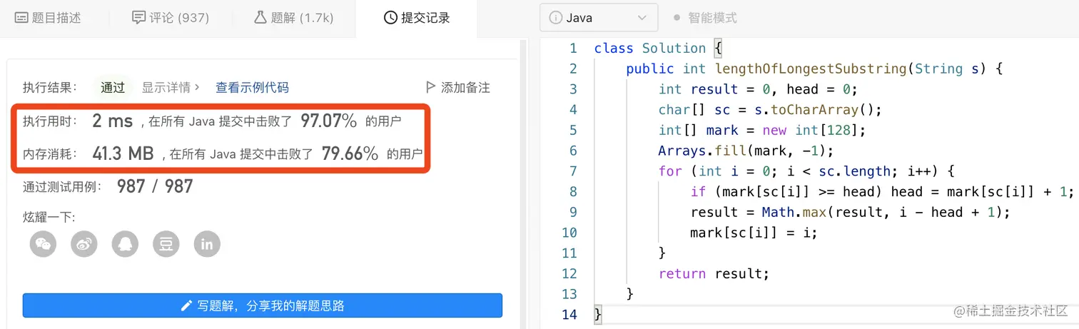 【如果mark[x] >= head】则表示发生了字符重复。那么当前这个子字符串就结束了。将head指向mark[x]+1的位置,作为全新的子字符串head指针。并且计算上一个子字符串的长度,如果大于历史最长子串长度,则赋值到result变量中。还有不要忘记了更新字符x在mark中的最新下标位置。
