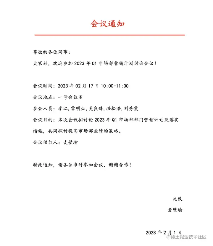 员工确定了会议主题、目的、时间、地点,以及参会人员后,就可以利用ChatGPT生成会议通知文案。经人工校对后,还可以结合明道云的打印模版,生成会议通知文件,派发给参会人员。