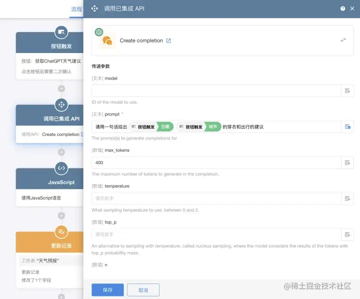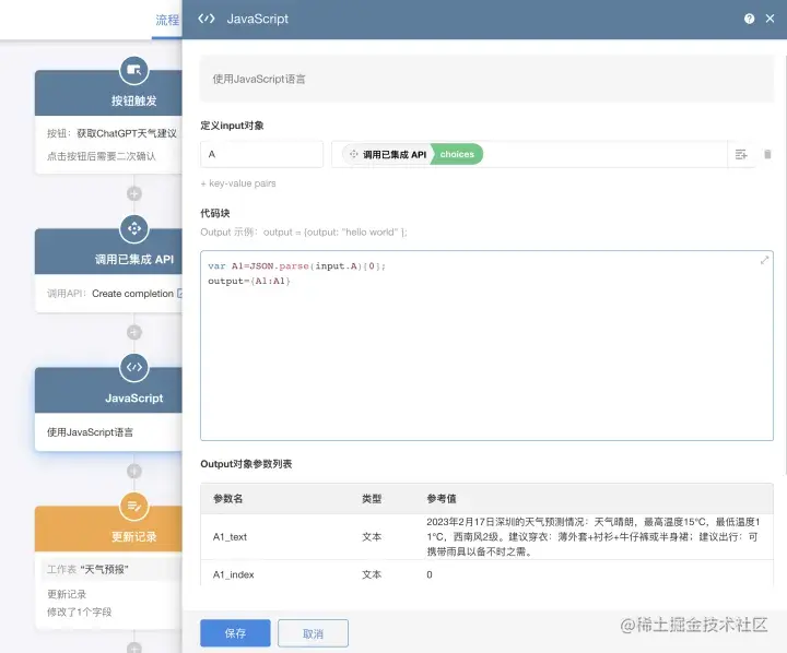 - 将「JavaScript」工作流节点得到的文本结果更新到「天气预报」的温馨提示字段里