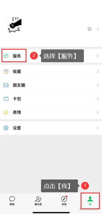 **步骤1:**打开微信应用程序,点击右下方的【我】,进入页面后,接着点击【服务】。