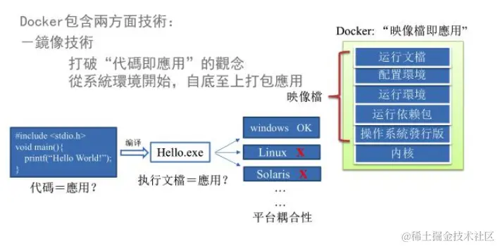 传统上认为,软件编码开发、测试结束后,所产出的结果即是程序或者能够编译执行的二进制字节码等。而为了让这些程序可以顺利的执行,开发团队也得准备完整的部署文件,让运维团队部署应用程序,开发需要清楚的告诉运维团队,用的全部配置文件+所有软件环境。不过,即使如此,仍然常常发生部署失败的状况。Docker镜像的设计,使用Docker得以打破过去【程序即应用】的观念。透过镜像(images)将作业系统核心,运作应用程式所需要的系统环境,由下而上打包,达到应用程式跨平台间的无缝接轨运作。