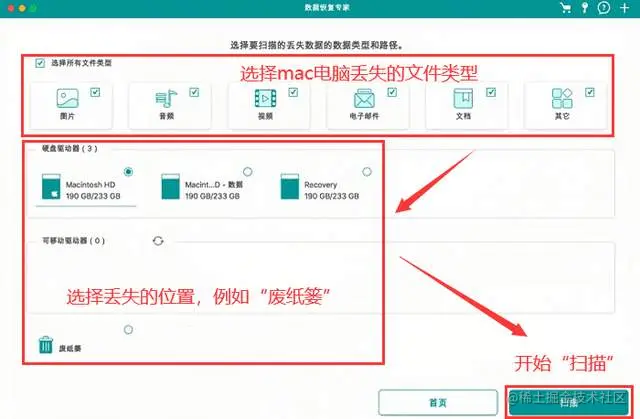 步骤2: 打开主界面,选定扫描范围【废纸篓】。用户还可以选定某一文件类型,节省时间。开始【扫描】。