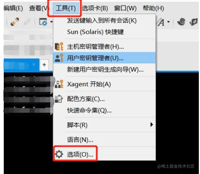 1,打开 Xshell 的菜单栏(如果没有显示菜单栏则按下Alt键),点击工具--选项。
