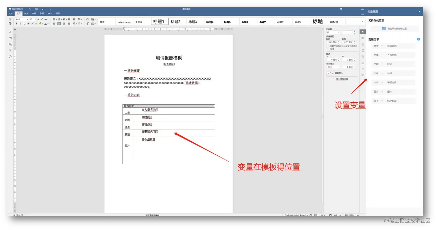 系统提供动态模板的创建能力,直接通过接口的模式传入文本、图片等形态的数据 ,动态参照模板创建格式化创建文档