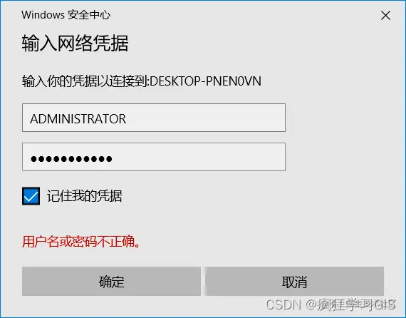 输入完毕后,点击“确定”,将弹出“Windows 安全中心”窗口。在这个窗口中,我们输入前面提到的电脑A对应的Windows用户账户名与密码即可。为了方便,我们可以选中“记住我的凭据”选项。