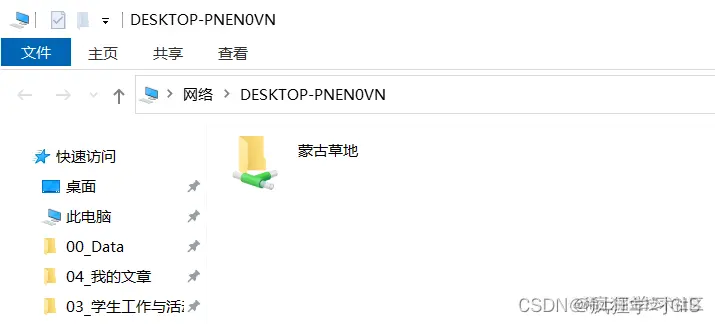 这里需要注意的是,从上图我们可以看到,此时电脑B中的蒙古草地文件夹其实并不是在本地,即是在“网络”中而非“此电脑”中;因此,此时我们在电脑B中对蒙古草地文件夹进行的修改会同步到电脑A。如果不想这样,可以将电脑B中的蒙古草地文件夹复制到电脑B自身的路径下(即电脑B的“此电脑”中),再进行修改即可。