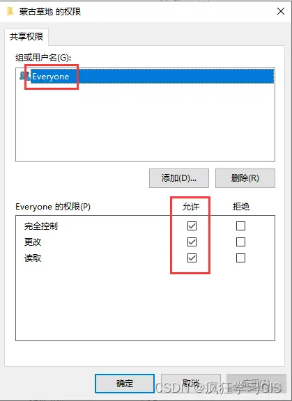 随后,在弹出的“蒙古草地 的权限”窗口中,首先在“组或用户名”一栏中选中Everyone选项,随后在下方的“Everyone 的权限”一栏中,将每一项都选中“允许”。