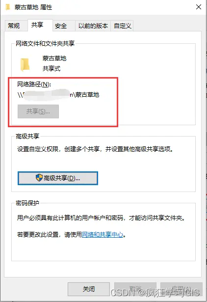 完成后,在“蒙古草地 属性”窗口中可以看到该文件夹已经有了“网络路径”,其中路径的第一段(也就是下图中我打了马赛克的部分)就是电脑A的“设备名称”。这里的“设备名称”大家需要记一下,后期会用到。