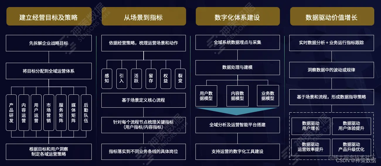 1、神策数据联合媒体一起深度分析其整体和不同业务上的经营目标,基于目标拆分运营策略。