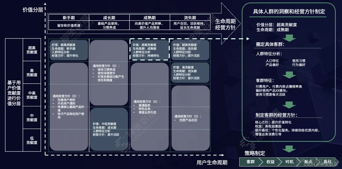 完成用户分层,媒体就可以对细分的用户群体进行特征分析,比如人口特征、使用习惯、行为偏好等,这些分析维度都可以沉淀在行业版的标签画像里。结合对不同群体的运营目标和媒体平台,制定针对性的经营方针、运营策略和规划,最终落实到客群、权益、时机、触点和素材运营五要素,结合神策智能运营产品,搭建媒体用户运营策略体系,实现数字化用户运营闭环。