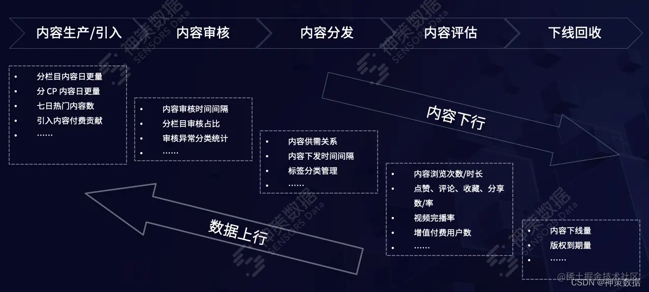 内容运营的一般工作流程包括内容的生产/引入、审核、分发运营、评估再到最后的下线。在流程下行过程中,媒体平台只是完成了工作任务,但在传统的工作流程中无法回答运营的最终效果与各项工作之间的关系,以及工作环节之间是如何互相影响等问题。而这恰恰是指导媒体内容运营模式转变、在新媒体时代更好地发挥内容价值的关键点。所以,在内容运营的流程中,需要加入一个数据上行的环节,让数据驱动每个环节的业务决策和反馈迭代形成闭环运营。神策数据在融媒行业版中梳理了媒体常用的数据指标、应用场景和策略,能够帮助媒体快速实现数据驱动内容运营。