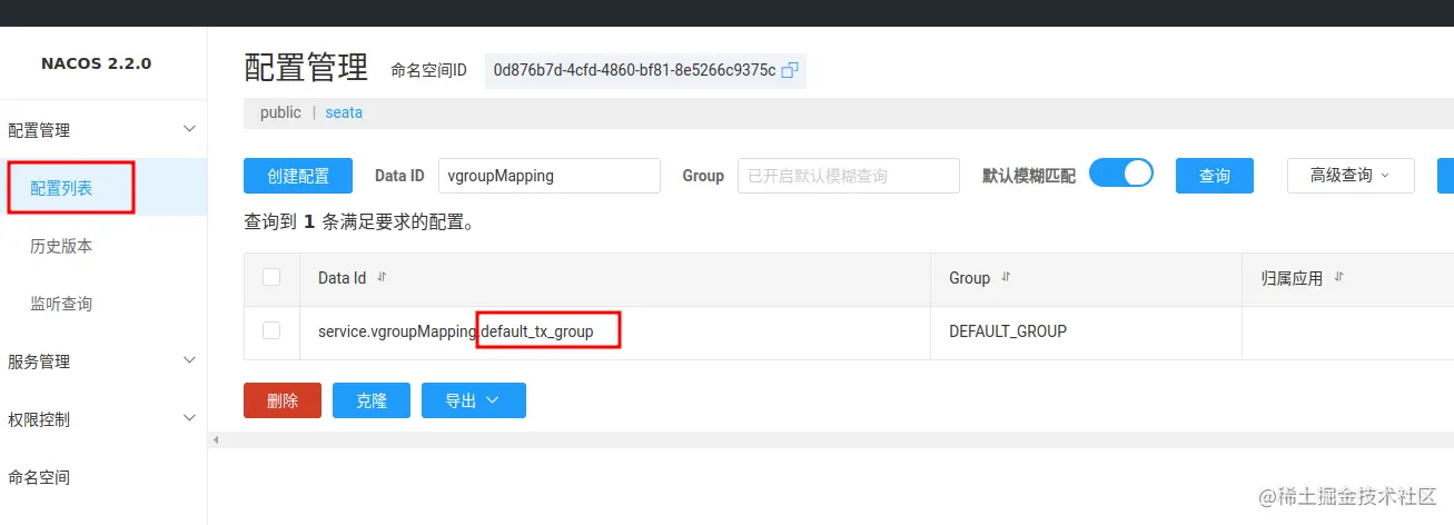- tx-service-group 为事务群组,要部署同一套分布式事务的微服务要求事务群组要一致。可以在 nacos 的配置中查询 :service.vgroupMapping.xxx。