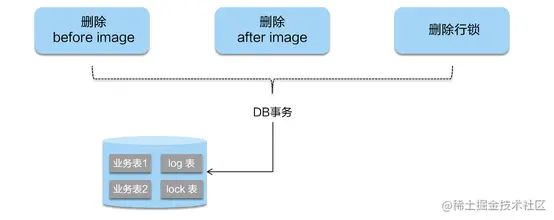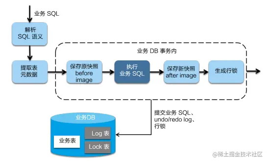 Seata 拦截“业务 SQL”,首先解析 SQL 语义,找到“业务 SQL”要更新的业务数据,在业务数据被更新前,将其保存成before image,然后执行“业务 SQL”更新业务数据,在业务数据更新之后,再将其保存成after image,最后生成行锁。以上操作全部在一个数据库事务内完成,这样保证了一阶段操作的原子性。最后生成的before image和after image会保存到 undo log 表中