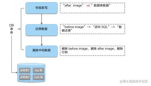 如果是回滚,Seata 就需要回滚一阶段已经执行的“业务 SQL”,还原业务数据。回滚方式便是用before image还原业务数据;但在还原前要首先要校验脏写,对比“数据库当前业务数据”和 “after image”,如果两份数据完全一致就说明没有脏写,可以还原业务数据,如果不一致就说明有脏写,出现脏写就需要转人工处理。
