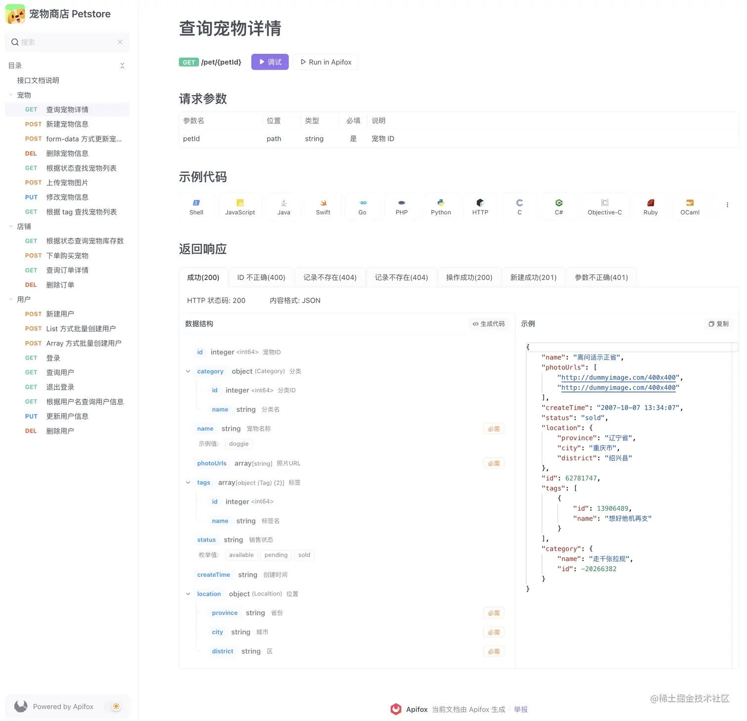 大家可以在线感受一下优秀的接口文档是怎样的:petstore.apifox.cn