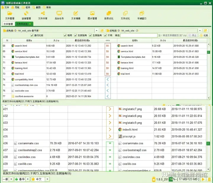 点击比较,会将相同、右侧独有、左侧独有、不同文件分别归纳显示,一目了然。