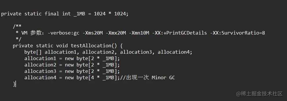 大多数情况下,对象在新生代 Eden 区中分配。当 Eden 区没有足够的空间进行分配时,虚拟机将发起一次 Minor GC 。举个例子,看下面的代码: