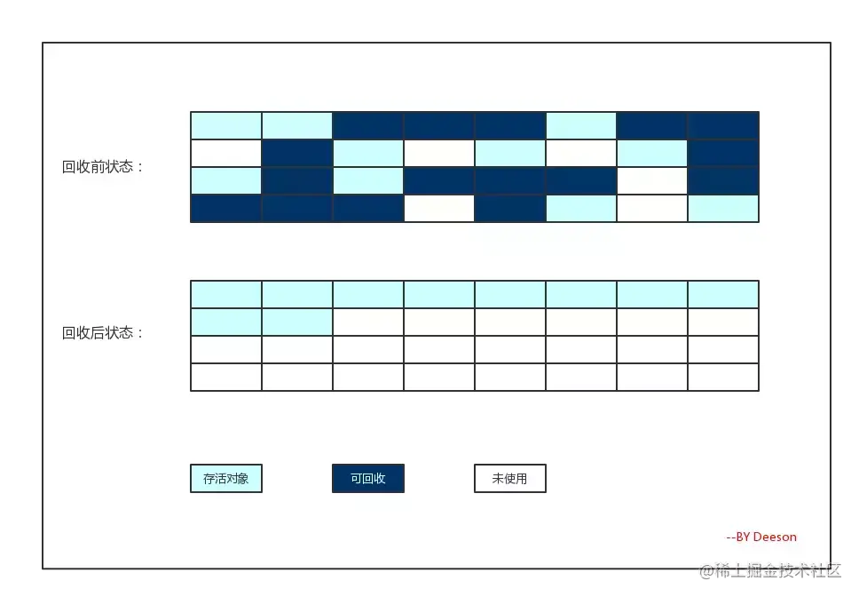 标记过程仍然与 “标记—清除” 算法一样,但后续步骤不是直接对可回收对象进行清理,而是让所有存活的对象都向一端移动,然后直接清理掉端边界以外的内存。