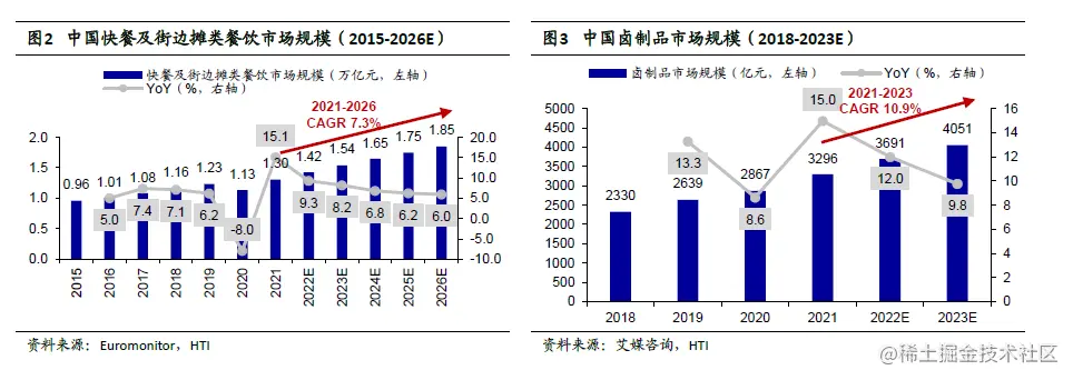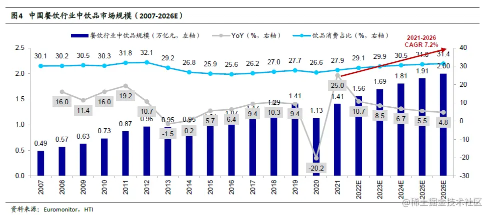 ①饮品市场规模大。2021年饮品市场规模1.41万亿元同比增长25%,预计2026年达2.0万亿元,2021-2026年CAGR 7.2%。