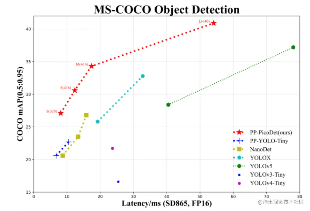 接下来,在PaddleDetection 提供的模型基线中,通过简单的对比可以发现,PP-PicoDet-s-416在速度-精度的平衡上达到了目前同等体量模型中的最优性能,因此本范例将选择此模型,进行后续的演示。