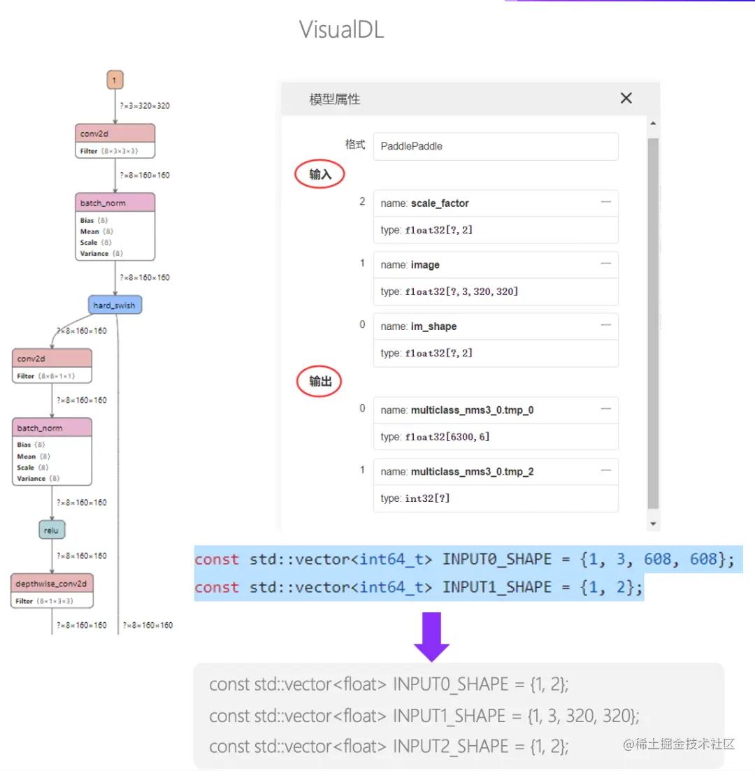 尤其需要注意的是,如果模型有多个输入,每一个模型输入都需要准确设置shape和data。具体如下图所示,可以通过飞桨可视化分析工具VisualDL查看模型的输入,并对照修改配置代码: