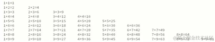 九九乘法表一共要分九行输出,输出样式如下图,并要求排版整齐。