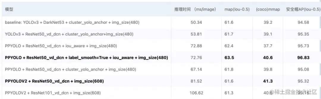 本项目采用YOLOv3模型作为基线模型,backbone为DarkNet53。优化策略包括backbone更换、模型架构更换、输入图像大小改变、IoU-aware、label smooth等优化技巧。