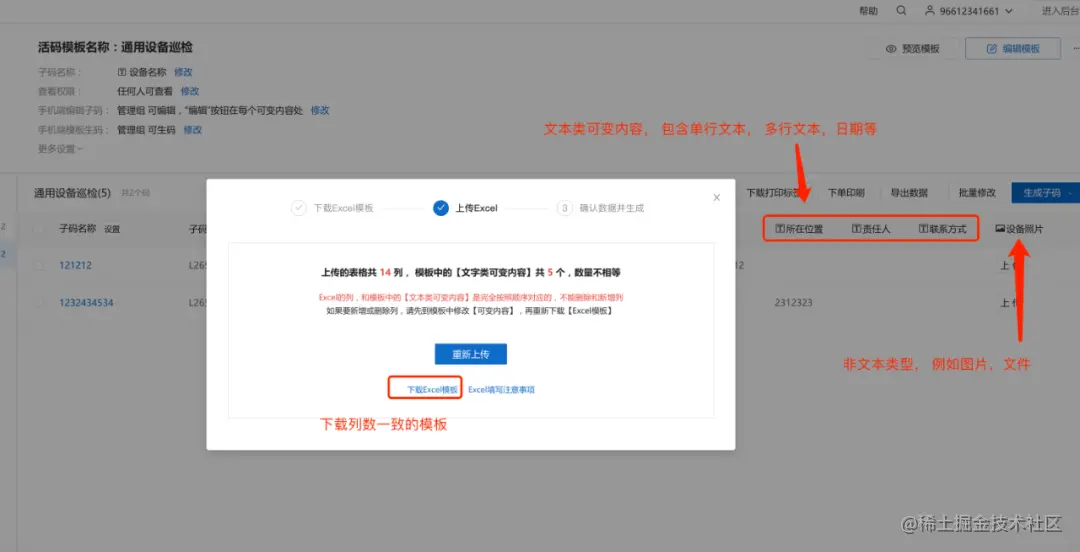 你好,复用批量模板上传excel生码 需要【 excel里的列数】和批量模板里的【文本类型可变内容数(非图片文件)】完全一致,如果出现你问题里的提示,你可以在弹窗下方直接下载包含该模板可变内容的Excel文件,详细可见附图。