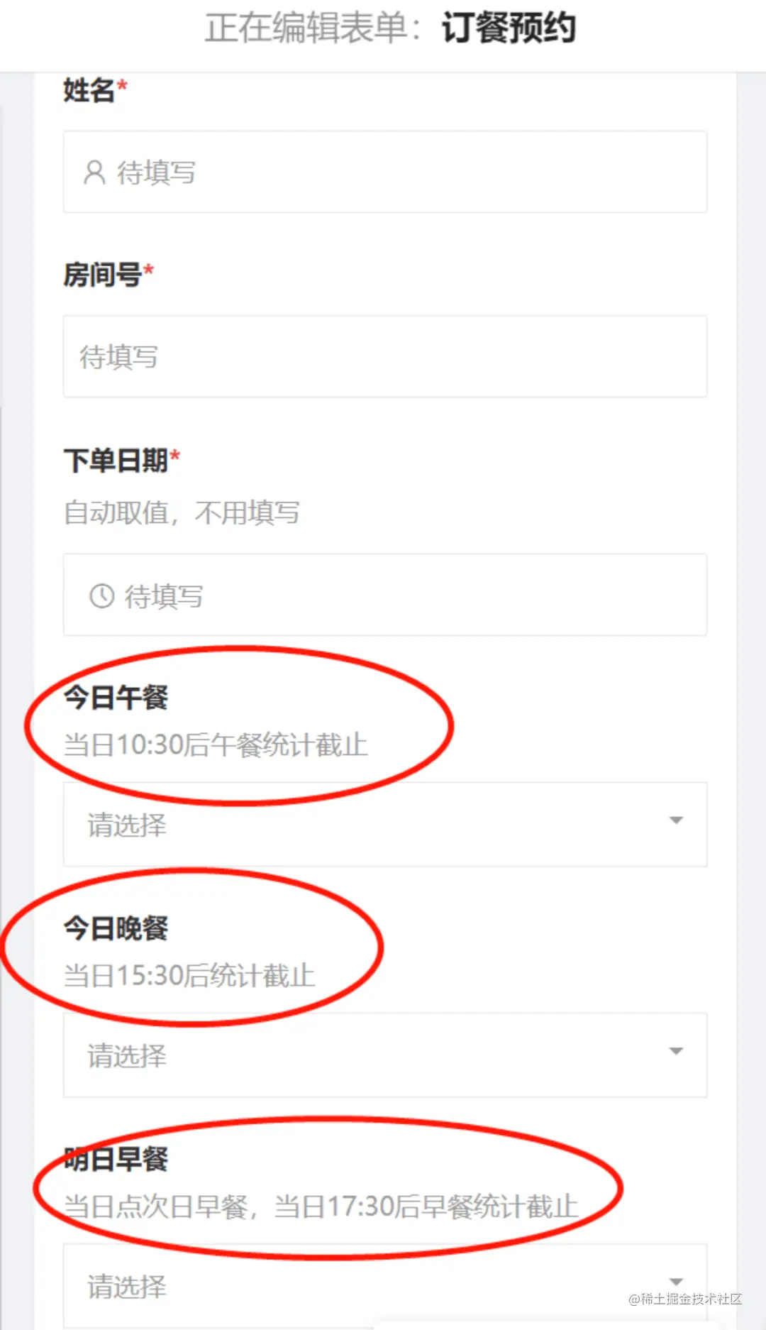可以在表单设置里面限制提交时间。详见附件。如果你要多个选项分别设置提交时间,建议做成3个表单。扫描后再操作面板上设3个表单:早餐预定、中餐预定、晚餐预定。