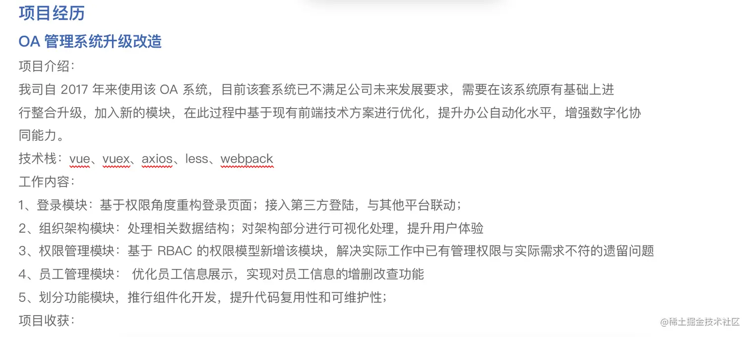 vue-element-admin为底层的后台管理项目的开发,当然, React类组件和hooks目前也在开发一些小项目,比如最近做了一个内容管理系统,采用的是 ReactHooks+RTK+antd的技术栈,另外,jquery一些传统型的项目也开过一些项目,但是目前传统项目越来越少,那些传统项目只是维护,没有什么新需求了, 大概也就这些。