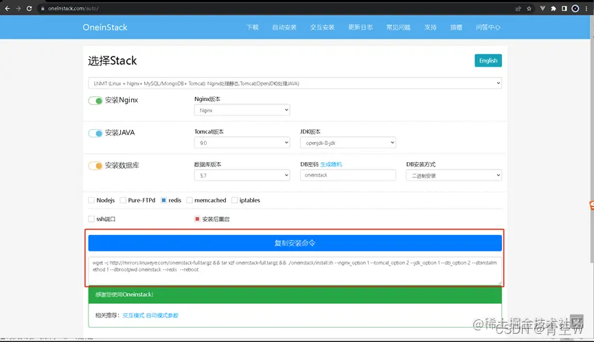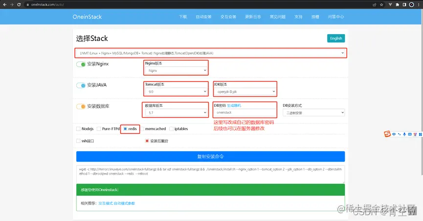 进入OneinStack - 一键PHP/JAVA安装工具官网,点击菜单栏自动安装,按照如图所示配置
