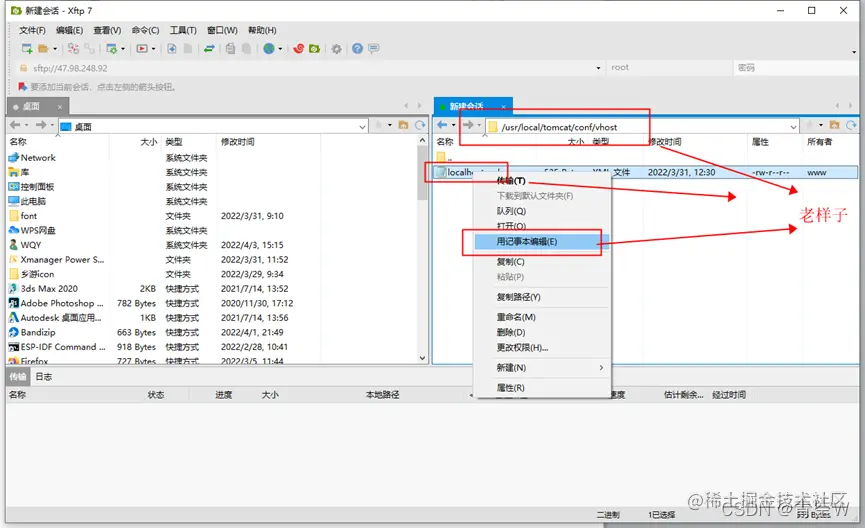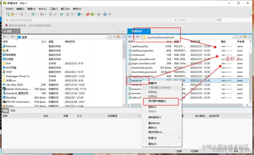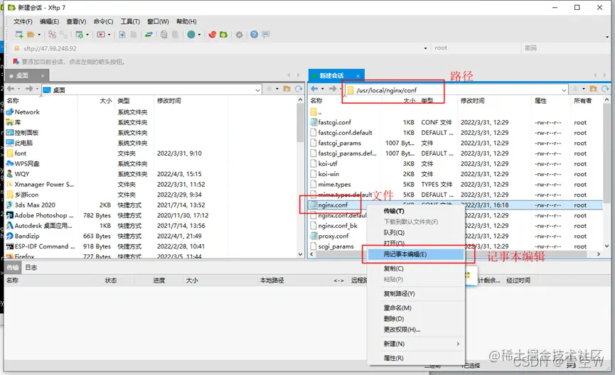 打开xftp,并连接到自己的服务,进入下图所示目录,找到nginx.conf文件,右键点击文件,点击用记事本编辑