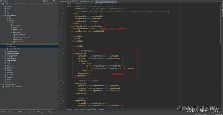 首先进入我们的后端项目,因为我们使用的是若以前后端分离的多模块版本,而且本教程打的是war包,因此我们需要修改一些配置,找到ruoyi-admin模块下的pom.xml文件