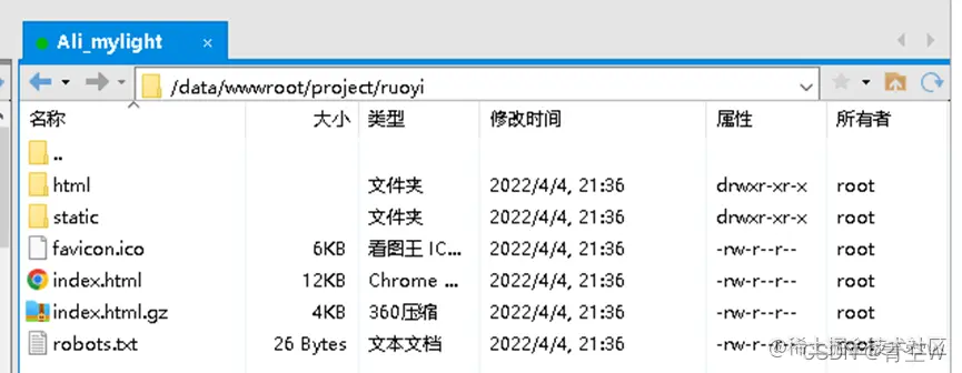 打包出来的文件会放在dist目录下,复制打包出来的所有内容到服务器内,目前发现的不能放在root目录下,推测是用户权限的问题,nginx找不到。推荐在/data/wwwroot目录下新建项目目录在复制进去,如图所示
