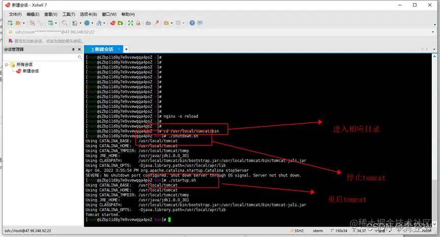 配置完成重新启动tomcat,用命令行进入tomcat的bin目录下/usr/local/tomcat/bin
