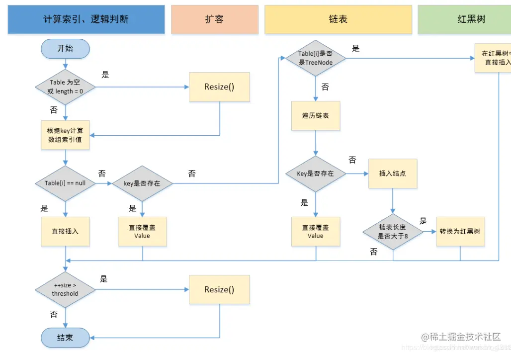 在putVal()中,我们看到在这个函数里面使用到了2次resize()方法,resize()方法表示的在进行第一次初始化时会对其进行扩容,或者当该数组的实际大小大于其临界值值(第一次为12),这个时候在扩容的同时也会伴随的桶上面的元素进行重新分发,这也是JDK1.8版本的一个优化的地方,在1.7中,扩容之后需要重新去计算其Hash值,根据Hash值对其进行分发,但在1.8版本中,则是根据在同一个桶的位置中进行判断(e.hash & oldCap)是否为0,重新进行hash分配后,该元素的位置要么停留在原始位置,要么移动到原始位置+增加的数组大小这个位置上。