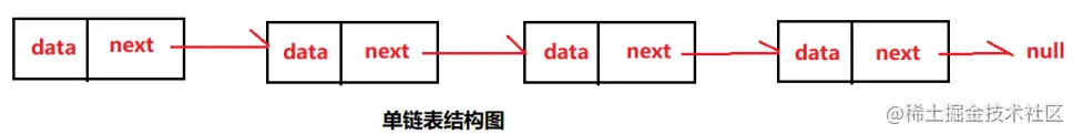 - 单链表:每个节点包含两部分,一部分存放数据变量的data,另一部分是指向下一节点的next指针