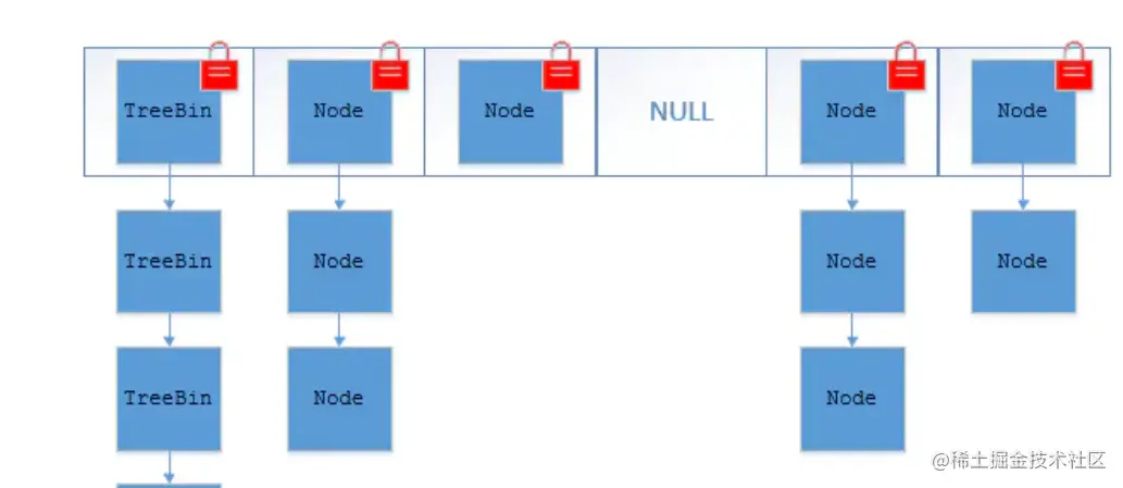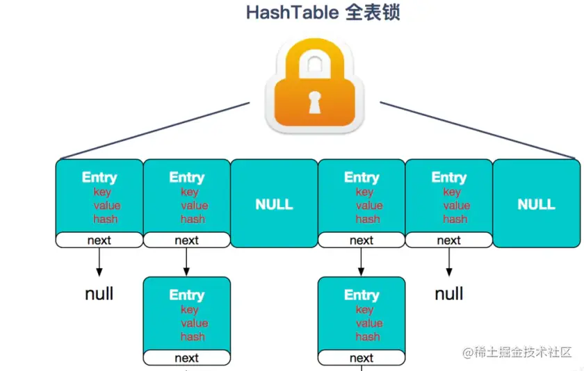 ② Hashtable(同一把锁) :使用 synchronized 来保证线程安全,效率非常低下。当一个线程访问同步方法时,其他线程也访问同步方法,可能会进入阻塞或轮询状态,如使用 put 添加元素,另一个线程不能使用 put 添加元素,也不能使用 get,竞争会越来越激烈效率越低。