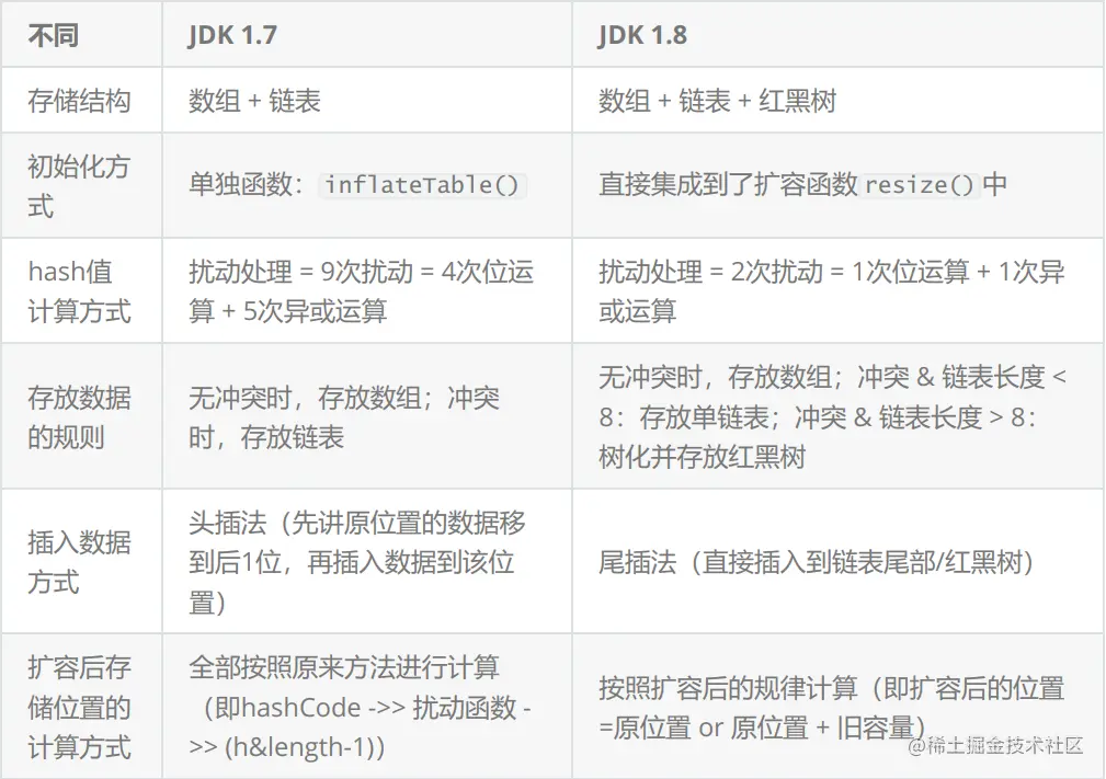JDK1.7的 ConcurrentHashMap 底层采用 分段的数组+链表 实现,JDK1.8采用的数据结构跟HashMap1.8的结构一样,数组+链表/红黑二叉树。Hashtable 和 JDK1.8之前的 HashMap 的底层数据结构类似都是采用 数组+链表 的形式,数组是 HashMap 的主体,链表则是主要为了解决哈希冲突而存在的;