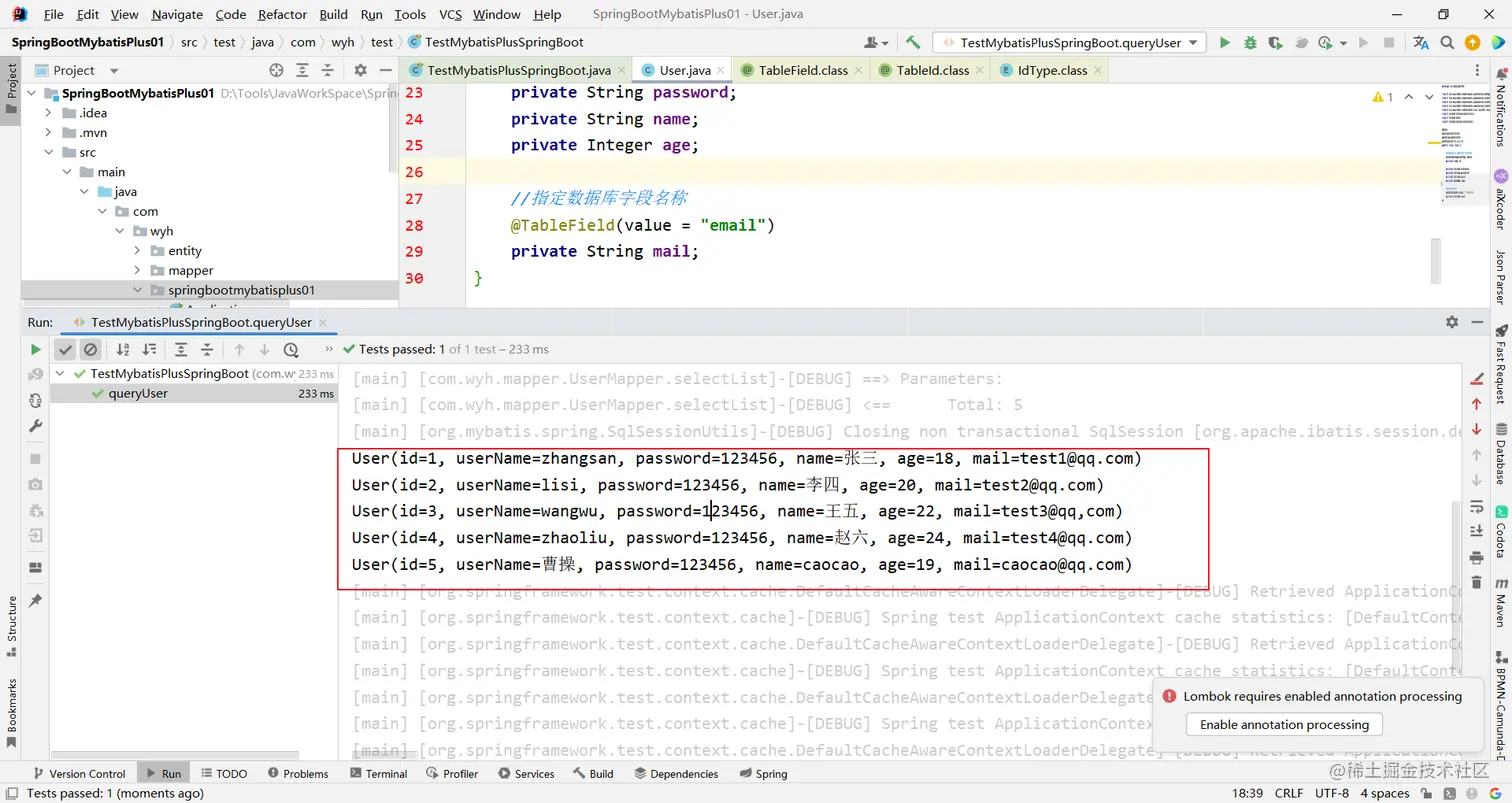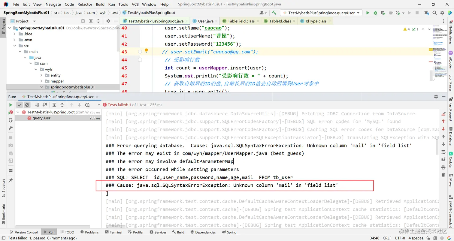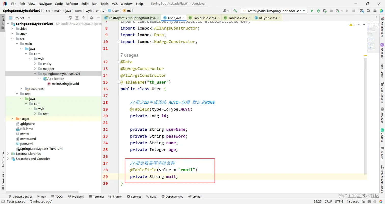 然后使用@TableField指定这个mail字段就是数据库里面的email字段